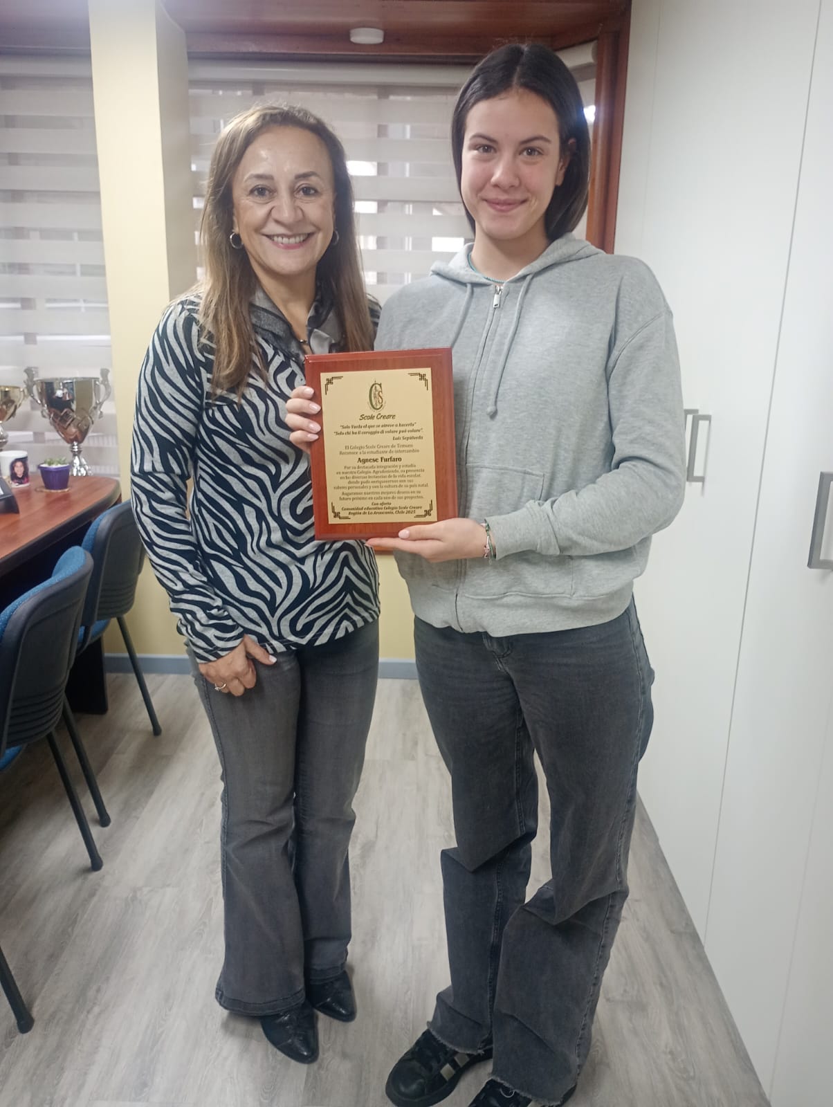 La estudiante Agnese, que proviene del sur de Italia, en las cercanías de Nápoles, formó parte de un programa de intercambio escolar de la Agencia internacional AFS, con quienes tenemos un convenio de colaboración como Colegio. Y su familia de acogida entre nosotros fue la familia Schiattino Molina, quienes con mucha alegría y disposición le acogieron, y con tristeza la tuvieron que despedir hace un par de semanas. A quienes les estamos agradecidos como comunidad escolar por acogerla y acompañarla durante este año.
